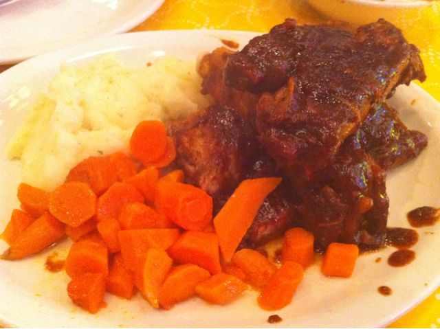 The ribs were a sloppy, drenched mess. I love ribs, but prefer rub bbq, these are slathered in a much-too-sweet sauce and were basically a waste of time. The garlic mashed potatoes were tasty, though.