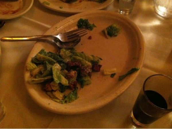 Either way, back to the Caesar. At Carmine’s, the crisp hearts of romaine lettuce are pretty well slathered with the thick, flavorful dressing. Our server put the anchovies on the side, but we all indulged.