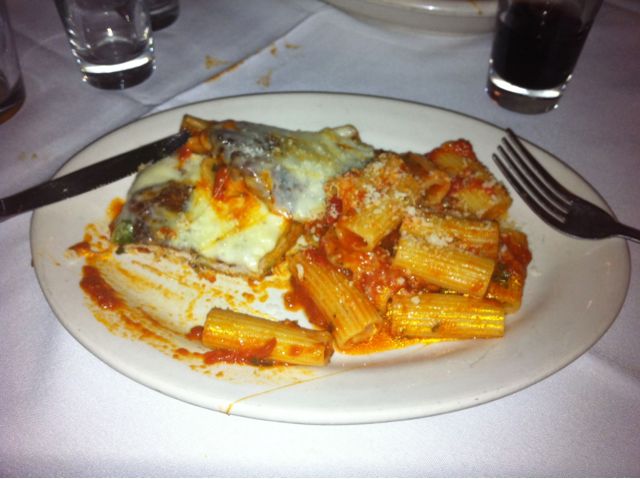 With a friend in from out of town, and simplicity being a virtue, we settled on Carmine’s. We were all pretty hungry, having doffed a quick martini before stepping out, and ordered a Caesar salad, a side order of sausage as an appetizer, and the veal parm over rigatoni for the main.