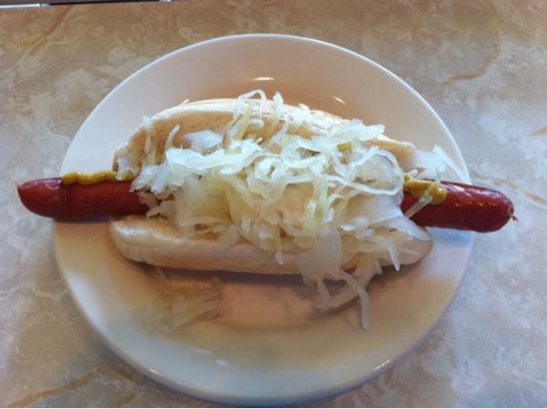The onions are sweet (rather than hot), and taste reminiscent of baked beans. On giving the matter further thought, I think the straight dog with mustard and kraut is the way to go.
