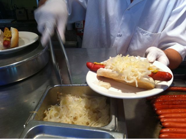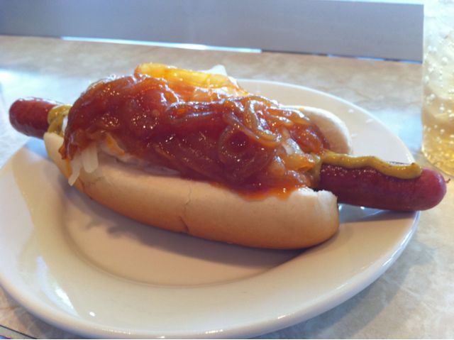 The onions are sweet (rather than hot), and taste reminiscent of baked beans. On giving the matter further thought, I think the straight dog with mustard and kraut is the way to go.