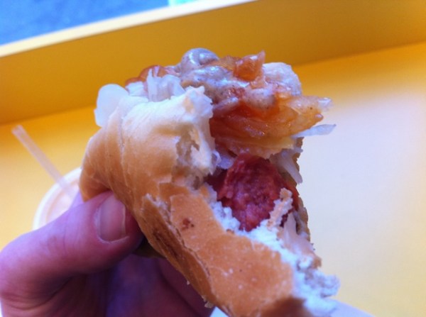 It’s with great disappointment that I report that the dog, while good, is not great. It does possess a very good snap, and the beef flavor is present, albeit muted. It’s greasy from sitting on the skillet surface.