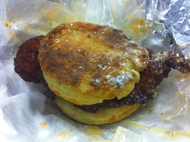 An oily spot that was totally worth it. Just look at that. That is a deep-fried piece of chicken stuck between two halves of a drenched-in-butter biscuit. It was like biting into some absurd fried meat cake. Delightful!