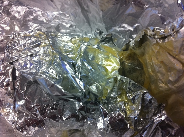 I beat a hasty retreat back to the office to dig into the chicken biscuit before it got cold. As you can see, the unboxing was, well, a bit sloppy. Butter was oozing across the tinfoil and I now have a nice, oily spot on my pants as a result.