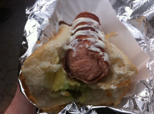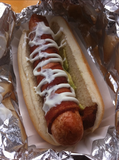 What you see before you is the Chihuahua Dog. It is (like many Crif Dogs) bacon wrapped, and served with freshly-scooped avocado. I watch the counterman work his knife expertly through the avocado and set it into the bun. Atop the dog is, of course, sour cream (naturally).