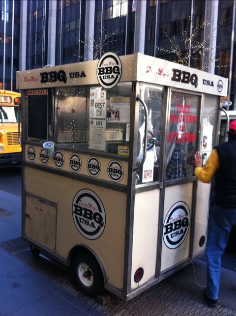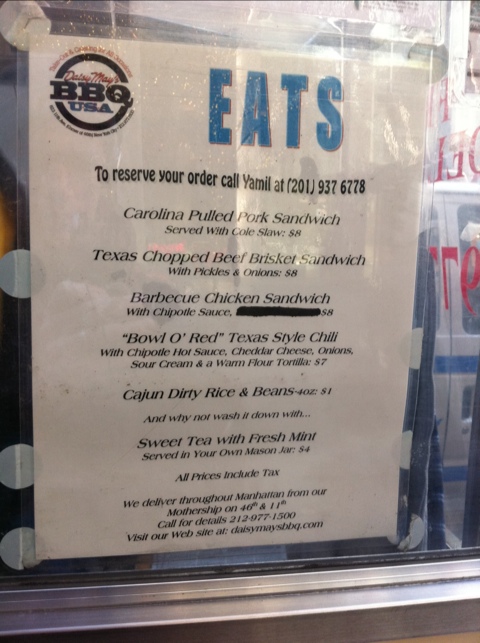 It’s hard to imagine that I need to tell anybody about wonderful Daisy May’s BBQ. There aren’t many BBQ joints in NYC, and even fewer of them are any good, so Daisy May’s is a standout. To this date I’ve yet to visit their mothership storefront on the far West side of Midtown, but I’ve been going to their cart for years. Indeed, their cart preceded to current food cart craze gripping the city (and me).