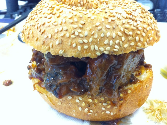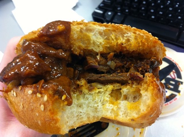 The sandwich was more than a little sloppy, with large chunks of brisket occassionally glopping out the side of the bun and onto my hand. The beef itself has typical bbq traits: it is smoky, with a strong sweet to it. Overall the flavor evokes a meat candy. The brisket chunks are large, neither fatty nor tough, and there’s a reasonable black bean note in the sauce. The pickles are also pleasant, with a touch more of a vinegar note.