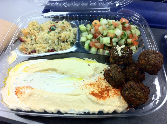 The platter contained quite a bit of food. On the right, you can see the Israeli salad (cucumber, tomato, parsley with a lemon/mint dressing). On the left, the Quinoa salad (dried cranberries, chick peas, preserved lemon and herbal seasoning). Up front you’ll notice the delicious spread of hummus, and of course the small falafels.