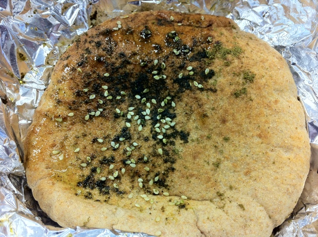 While bread and I generally haven’t been getting along too well lately (the devil white flour and all that), the smell of this pita was heavenly. The pita was warm, fluffly and seasoned with a brushing of oil and herbs. It was pretty decadent.