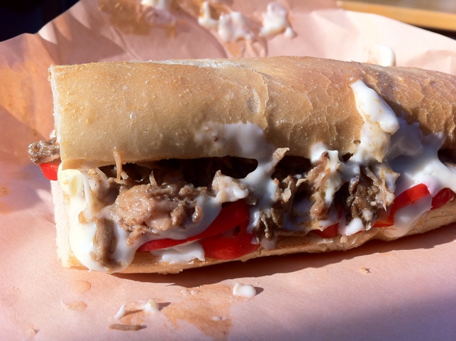 Ok, so it’s still cold, but it was sufficiently less cold for me to take another run at the Holiday Pop-Up Market in Columbus Circle, especially since they’re shutting down in just a few days. This time, though, I thought I’d take a run at the Fatty Crew beef sandwich, since it sort of looked sexy, and I am a fan (more or less) of Fatty Crab.