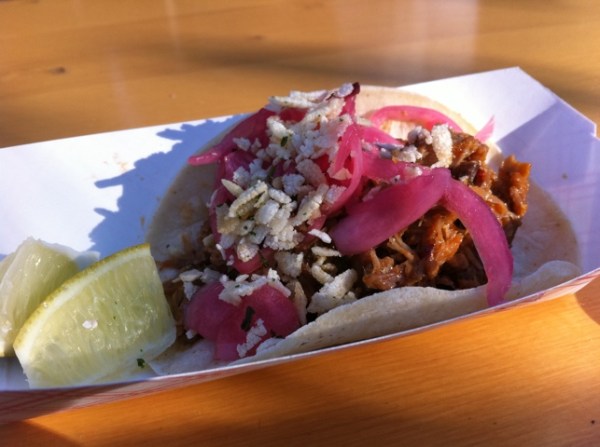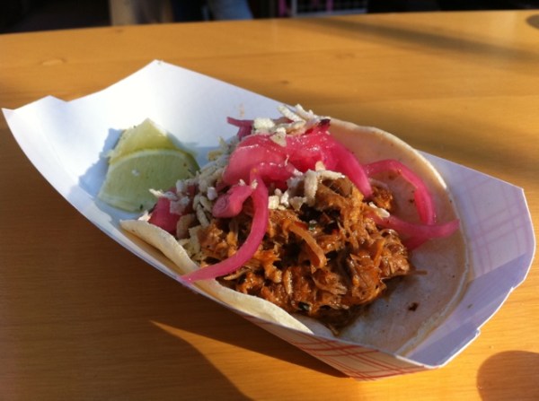 Determined not to let the whole effort be a complete waste, I decided to sample a $3 carnita from Cascabel. It too is quite small, although it is a good portion of meat. They give you some lime to squeeze on top. Guess what? It was delicious.