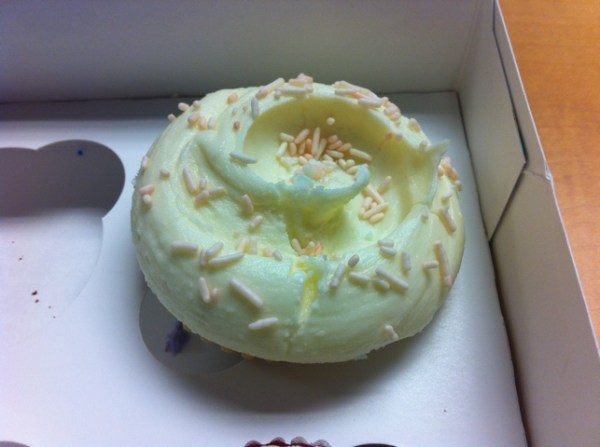 I’m partial to the vanilla cupcake/vanilla frosting combo, myself, even if the frosting is mixed with chartreuse #6 or some other food coloring. Either way, it’s a yummy, thick buttercream frosting. Of course, the sponginess and freshness of the cake portion is absolutely vital to the success of a cupcake too. On this day, it was a bit stale, but still tasty. There’s a slight aftertaste to Magnolia that I can’t quite put my finger on. It tastes like… I don’t know, some chemical flavor, or something artificial. At first bite, there’s buttery goodness, goobers of frosting, etc. – everything you’d want from a cupcake. But somehow afterwards there’s a faint tart note that just doesn’t read right. This is extreme nit-picking, but there you have it.