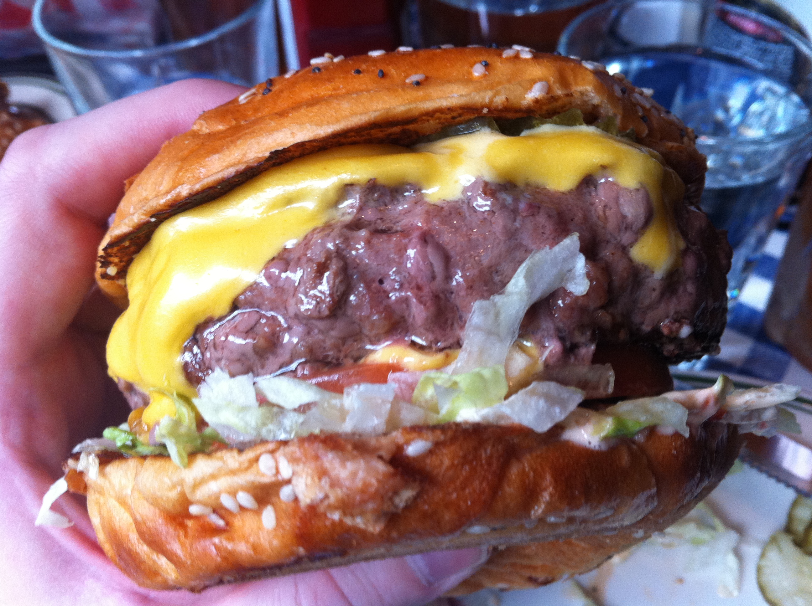For $6.95, you can get their standard 5 ounce patty. For $8.95, they’ll make a hand-shaped 8 ouncer. I went for the jumbo. However, it has some design flaws. See how they put the shredded lettuce underneath it? Notice all the juices? That will come to be a bit of a problem later. But first, how about the flavor?