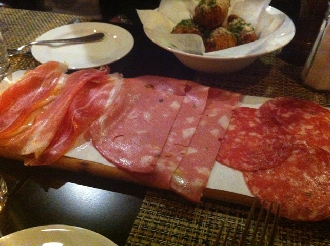We also indulged in a salumi board. As you can see, we were served three slices of our choice of fare, we selected the prosciutto, mortadella dn sopprassata. Everybody likes a salumi plate, these were room temperature and pleasing, with a good (but not overwhelming) salt.