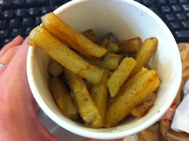 Guess what? This time, the burger was actually ok. It was the first time I had a burger from them that even seemed like something I might speak well about. I order mine with lettuce, tomato, onion, light ketchup and light mayo. As you might be able to make out, the burger from Five Guys is actually two patties stacked atop each other. Honorable mention, by the way, to the bun, which was sesame seeded and pretty tasty, in a devil white flour sort of way. It swiftly degenerated into a soft smushy glob.