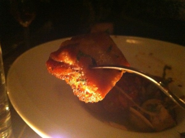 The little necks themselves were underwhelming. They were steamed, but didn’t seem as fat and fresh as others I’ve had. As you can see in the picture, their size was smaller even for a little neck, barely clearing the tines of the special, small fork served with them to pluck them out. They seemed almost to be a garnish, or flavor counterpoint, for the fat pork belly.