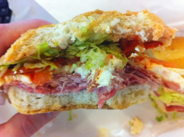 Look, the sandwich has got all the right elements, but the bread is nothing special. And because there’s a serious amount of it, having simply generic(ish) bread ain’t gonna cut it. Don’t get me wrong, this is not the mush crap you get at most places, the kind that is a lot of air and not much more. But it’s also not truly dynamite bread that would set off all the flavors, give you a little bit of a fight when you try to tear it, and taste as fresh as the rest of the ingredients of the sandwich. The contents are just fine, that dead bread is what kills it. OK, “kill” is a bit strong, but it’s not going to hit the high note the meats and more within are aspiring to until they sort out a better hero roll – especially since you’re dropping $11 on it.
