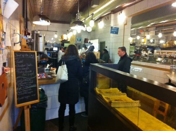 Zucker’s looked to be essentially a downtown variation of the most excellent Murray’s Sturgeon shop, which I absolutely adore. It sells smoked fish, bagels and (importantly) bialys. Jewish soul food. As you can see, the small seating area is cozy and looks like a great place to sip a cup of coffee, read the paper, nosh on some food and generally ease into your day. Does anybody get to do that anymore? If I lived downtown, probably I’d move in to this place.