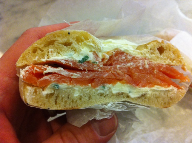 The scallion cream cheese needed a little bit of work. The scallions, which add a key component of flavor to the sandwich, seemed barely noticeable in the creamy spread. There was enough of them though for one piece to get stuck in my teeth, but mostly it was just cream cheese. Scallions add a strong, pungent earthy note that plays beautifully off the thick cream and the salty, smoky richness of the nova. Perhaps I am just used to the stuff from Murray’s, but this scallion cream cheese wasn’t quite as good to me.