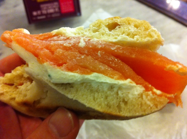 The biggest grouses I had with the sandwich though, are these: first of all, there was a moment of pilot error. I ordered it on a bialy and got it on a bialy, but what I really wanted was a toasted bialy. The gentlemen behind the counter didn’t offer to toast it so my slip-up went unnoticed until I got the sandwich.