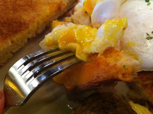 It eventually arrived at our table, and as you can see it was very well presented. The home-made bread essentially resembles a thick cut of fluffy white bread. The bread’s flavor was very sweet and rich, quite like challah. The dill and onion flavors weren’t noticeable to me. The egg was suitably runny, though one of them was slightly overdone and the center had somewhat solidified, but just barely. The eggs and toast together were lovely.