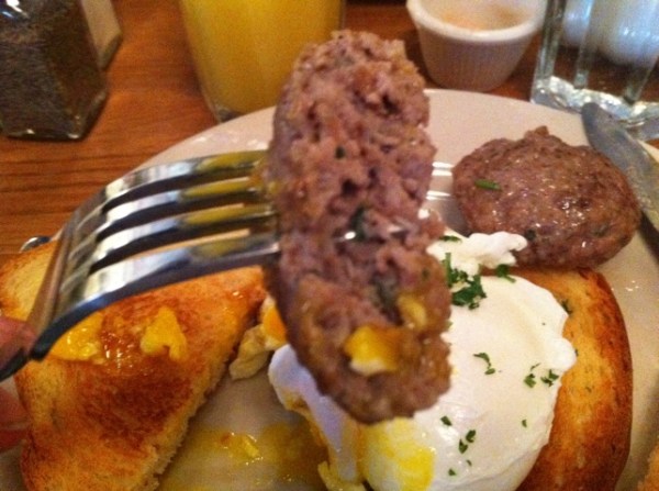 I ordered the Farmhouse Breakfast ($10.25). It consists of two poached eggs atop what they called home-made dill-onion toast and two pieces of home-made sausage. It sounded very good to me, and for the most part, it was.