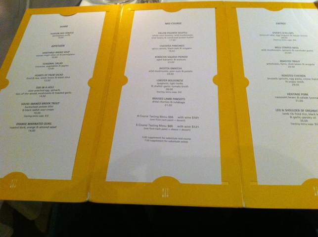 So let’s talk Telepan. It’s a swanky restaurant that generally gets raves and I am about to praise my recent meal there too. They offer a 4 course meal for $55 ($101 with wine pairings) or a 5 course for $65, or $121 with wine pairings. Considering how easy it is to blow $100 on a crap meal in NYC, this is a great offer.