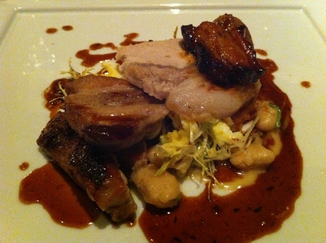 The pork was also interesting – a “moderne” take on the staple. Southern cooking meets haute cuisine. It included several different preparations of pork, including some sausage, and some bacon, served over a slaw.