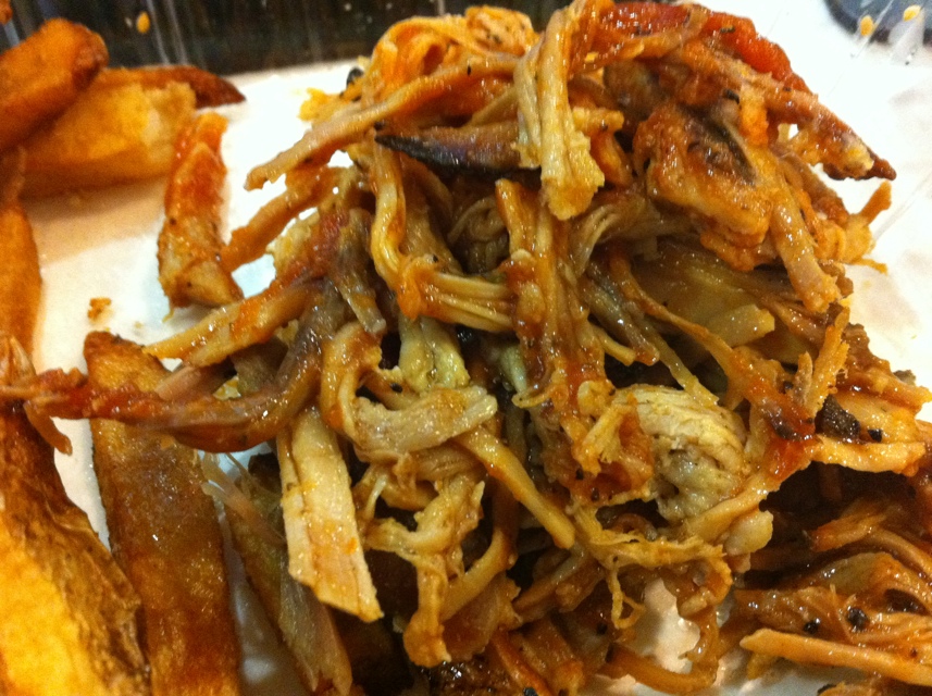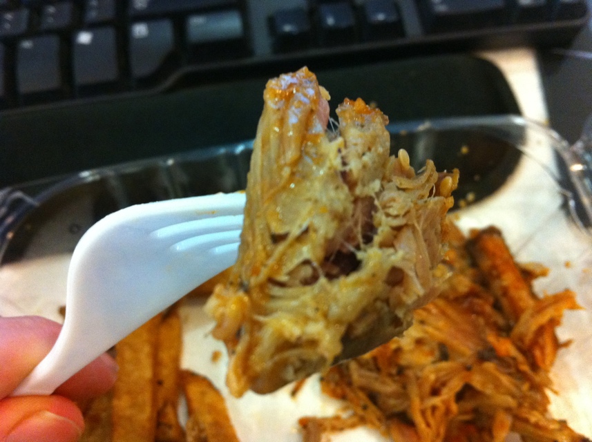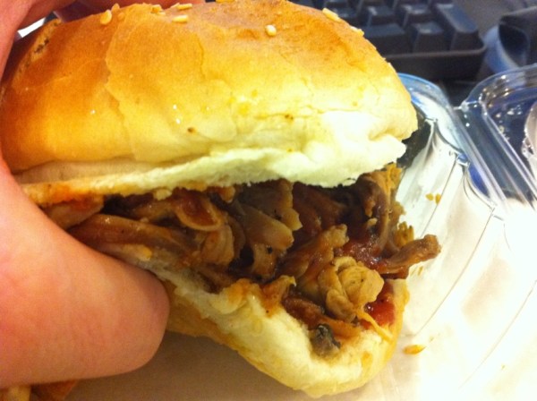 Visually, the pork looked pretty good. Thick, ropey pieces of pulled pork, with some heft, not reduced to that fatty gel you can get at some crap places. That said, the bun was useless, sopped through and falling apart. I ditched it and put the pork in a pile.