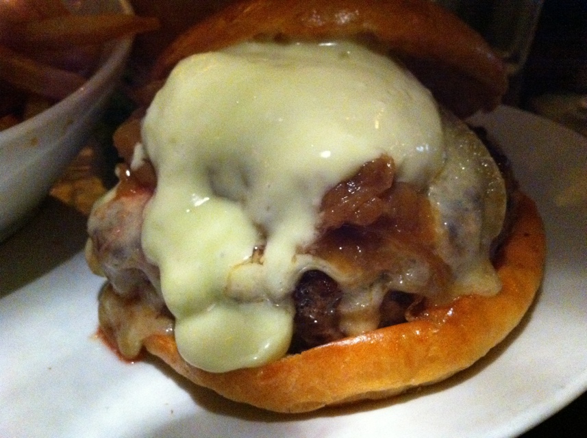 So the easiest way to understand a Five Napkin Burger is to think of it as an onion soup burger, though there is perhaps a bit more going on with it than that. It consists of 10 ounces of what they call custom ground beef, a slathering of gruyere, caramelized onions and rosemary aioli. All this sits on top of a soft, white roll. It is a very large burger – a serious amount of food. It really does seem to me that they’ve taken delicious beef, dunked it in a batch of onion soup, topped with gruyere and served it. But why call it a “Five Napkin” burger?