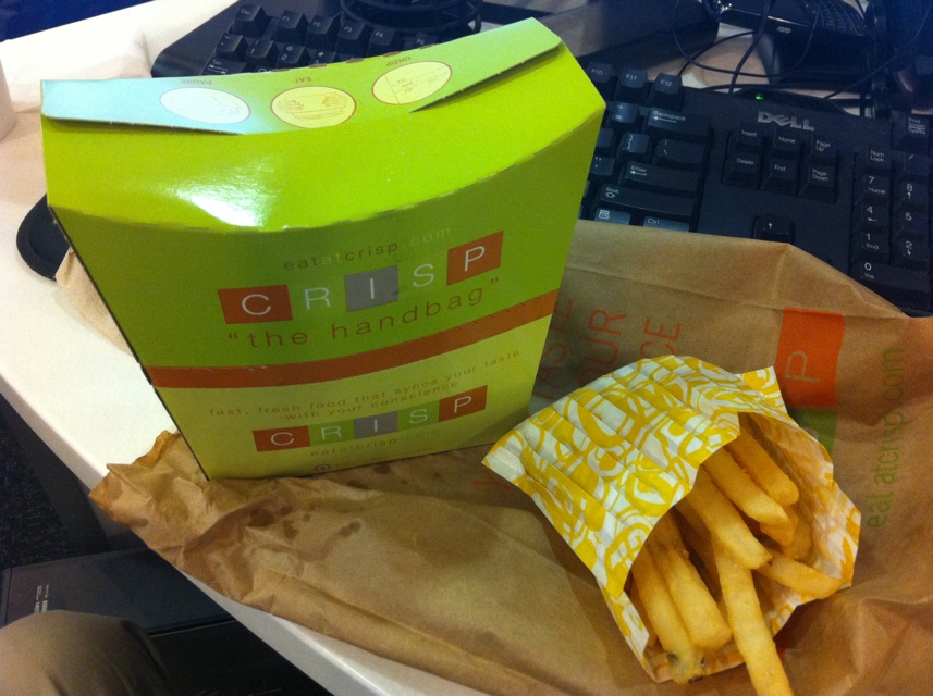 Far and away, this is the freshest and, well, most crisp salad components I’ve had in a falafel. Usually they are wilted and look a bit rough around the edges. Not so at Crisp, where I think their name is especially apropos. I was delighted with the quality and quantity of lettuce, cherry tomato and onions in the sandwich. The fries, which was certainly a good portion for just $1, were lightly fried and tasty. It wasn’t clear I need them, since the falafel itself is a significant portion.