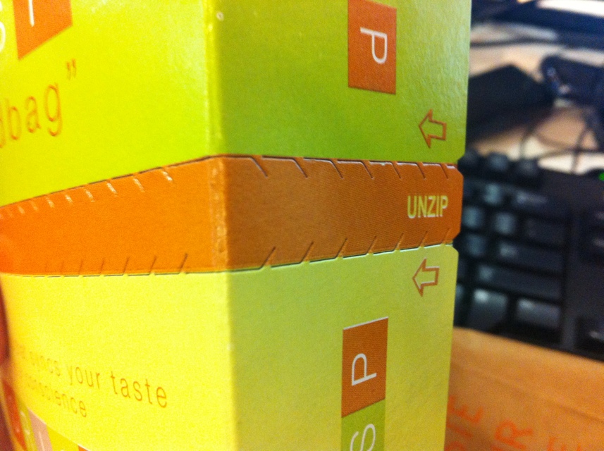 One thing that might be driving the price of their falafel up is their elaborate packaging, which they dub “the handbag.” Actually, it is fairly awesome, if somewhat wasteful. It has a zip-pull in the middle of it which essentially decapitates the box, revealing the falafel within. This gives you something quite convenient (and not messy!) to hold onto as you begin devouring the sandwich. Nonetheless, it’s an elaborate piece of tech for a falafel.