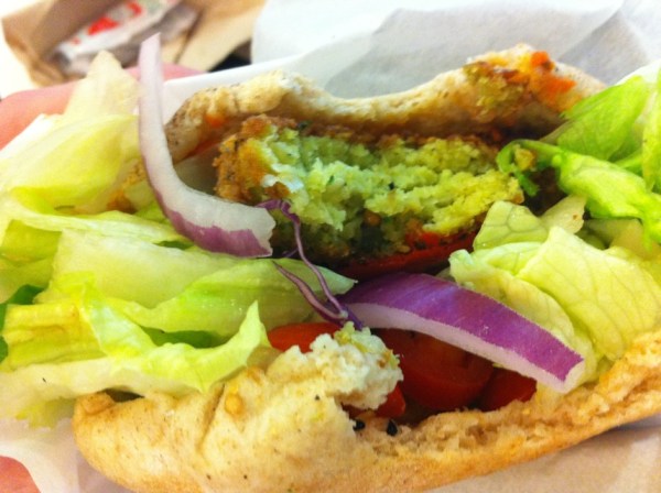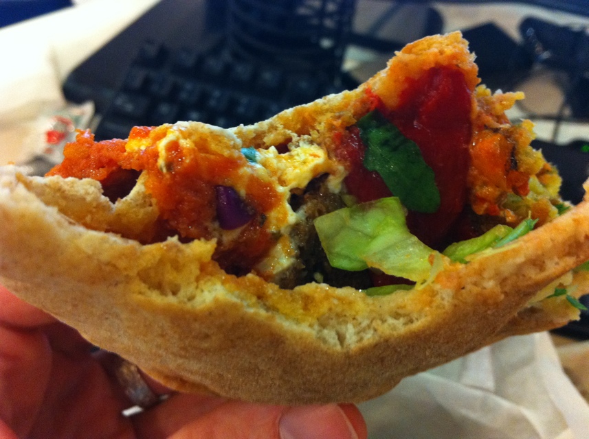 As you can tell, I well enjoyed the sandwich. I think you guys offer a very fresh and delicious product. If the folks are now smearing the various sauces around the inside of the pita before adding the remains of the ingredients, there’s no reason I can think why it wouldn’t be a total win.