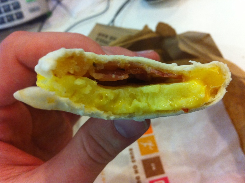 They offered something called a breakfast wrap with egg and cheese for .99 cents. Adding bacon or sausage would bring the price up to $1.29. They were also half the calories (and less than half the price) of their other eggy offerings, so I figured what the heck, let’s give them a run.