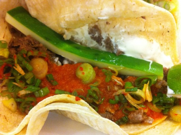 What you’re looking at above was the suggestion of Dennis, the owner/operator of the truck. From left to right above, you have beef, spicy pork and spicy chicken. We’ll take them one at a time.