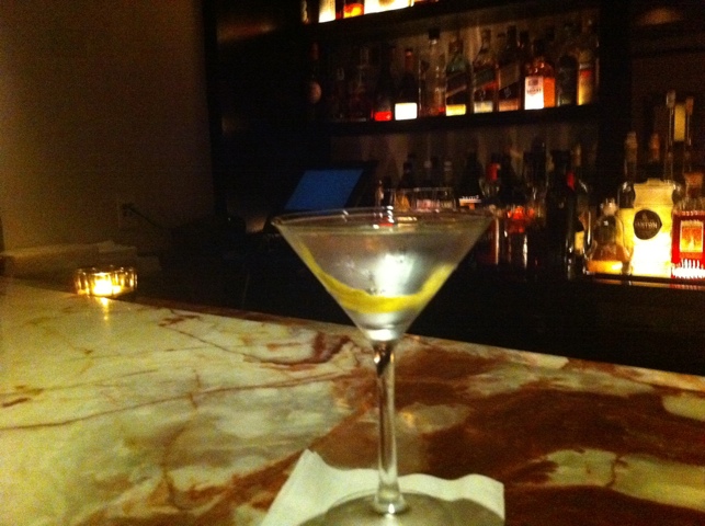 The evening started off promisingly enough. The bartender employed an interesting technique when prepping the martini: he poured a splash of vermouth into the glass, swirled it around, and then dumped it out. Then he poured the chilled vodka in. A clever technique. Dressed with a twist, it was delicious.