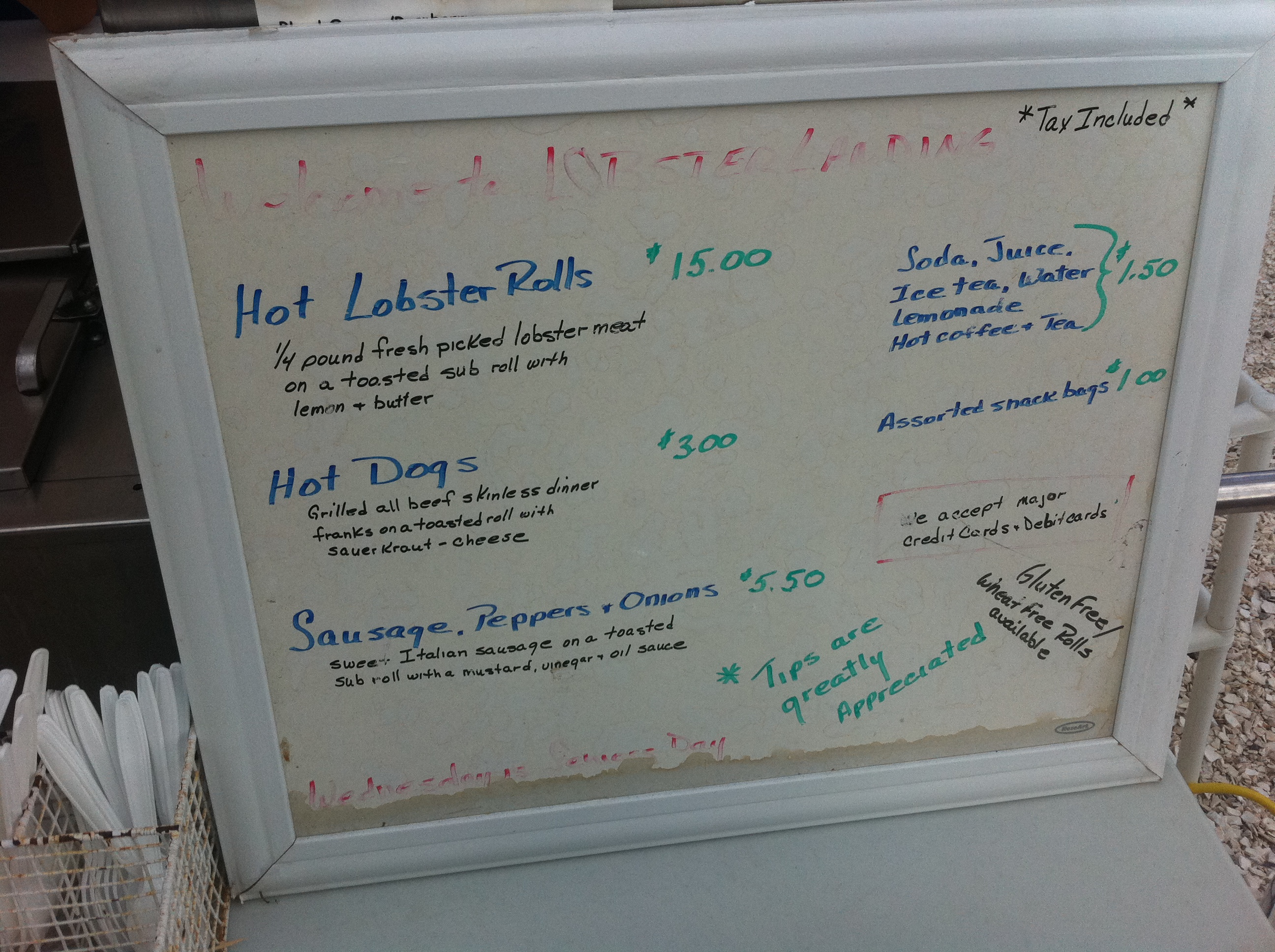 The menu itself seems to have a near identity crisis. On the one hand, Lobster rolls. That makes sense. On the other, sausage, peppers & onions or a hot dog? I didn’t know what to make of it (although part of me wants to go back and try the sausage & peppers, I’ll bet it’s good).