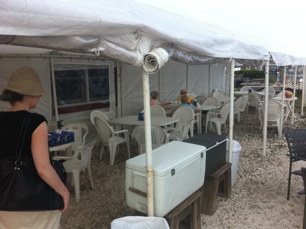Next to the shack is a tented area, where we were greeted by two giggling teens who took our order. Behind them are plastic seats and tables, and there are coolers from which you can pluck out a soda or lemonade or some such. The tables can’t be much more than three feet from the water.