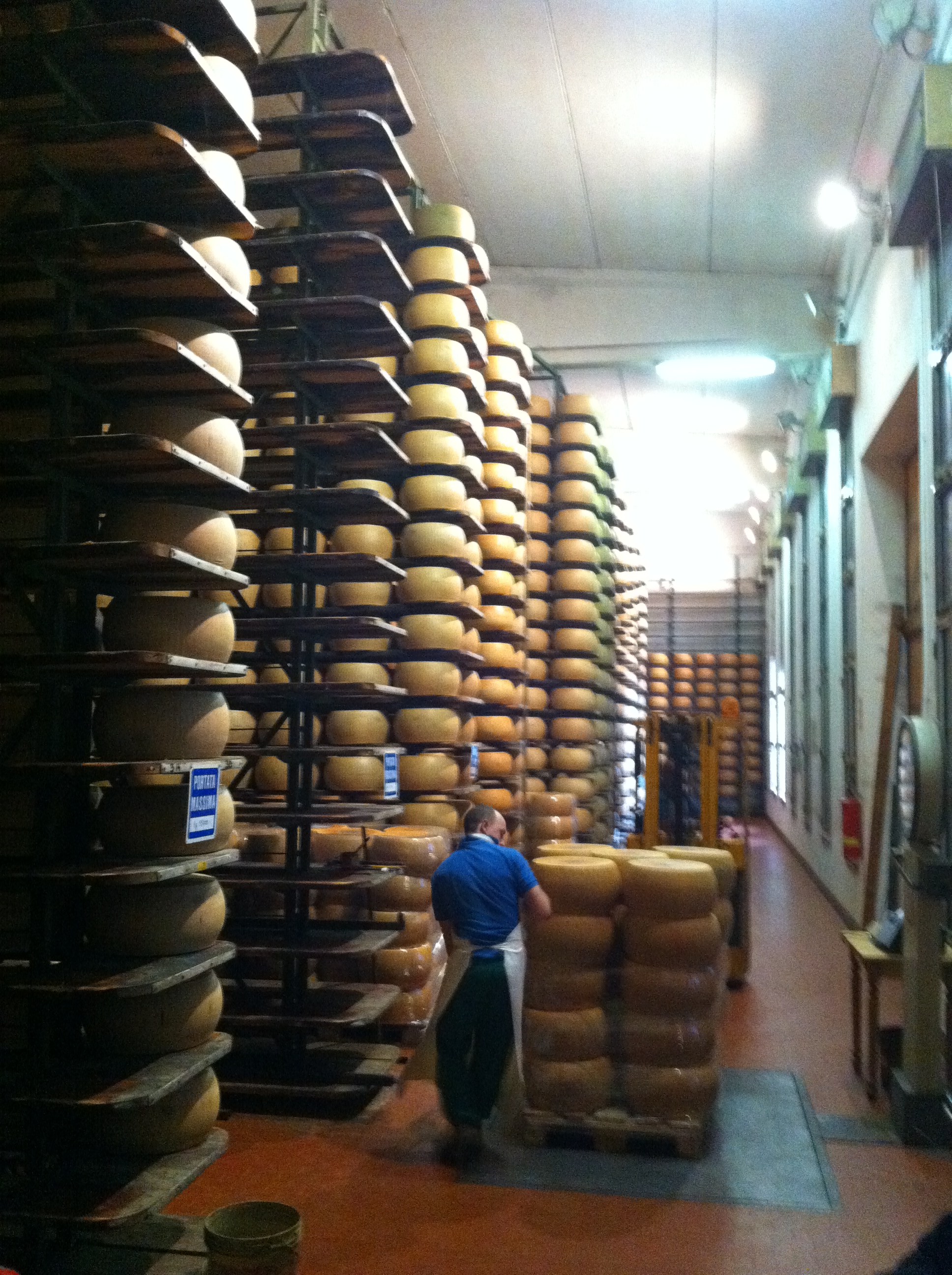 What you’re looking at above is a cheese vault in Parma, Italy. I am not kidding when I use that language. There are bars on the windows, the place is padlocked and shuttered. It’s a vault, and it needs to be: Each one of those massive wheels of cheese is worth hundreds of Euros. You can see how high the racks go, and can well imagine how deep. Banks lend against that inventory – no joke.