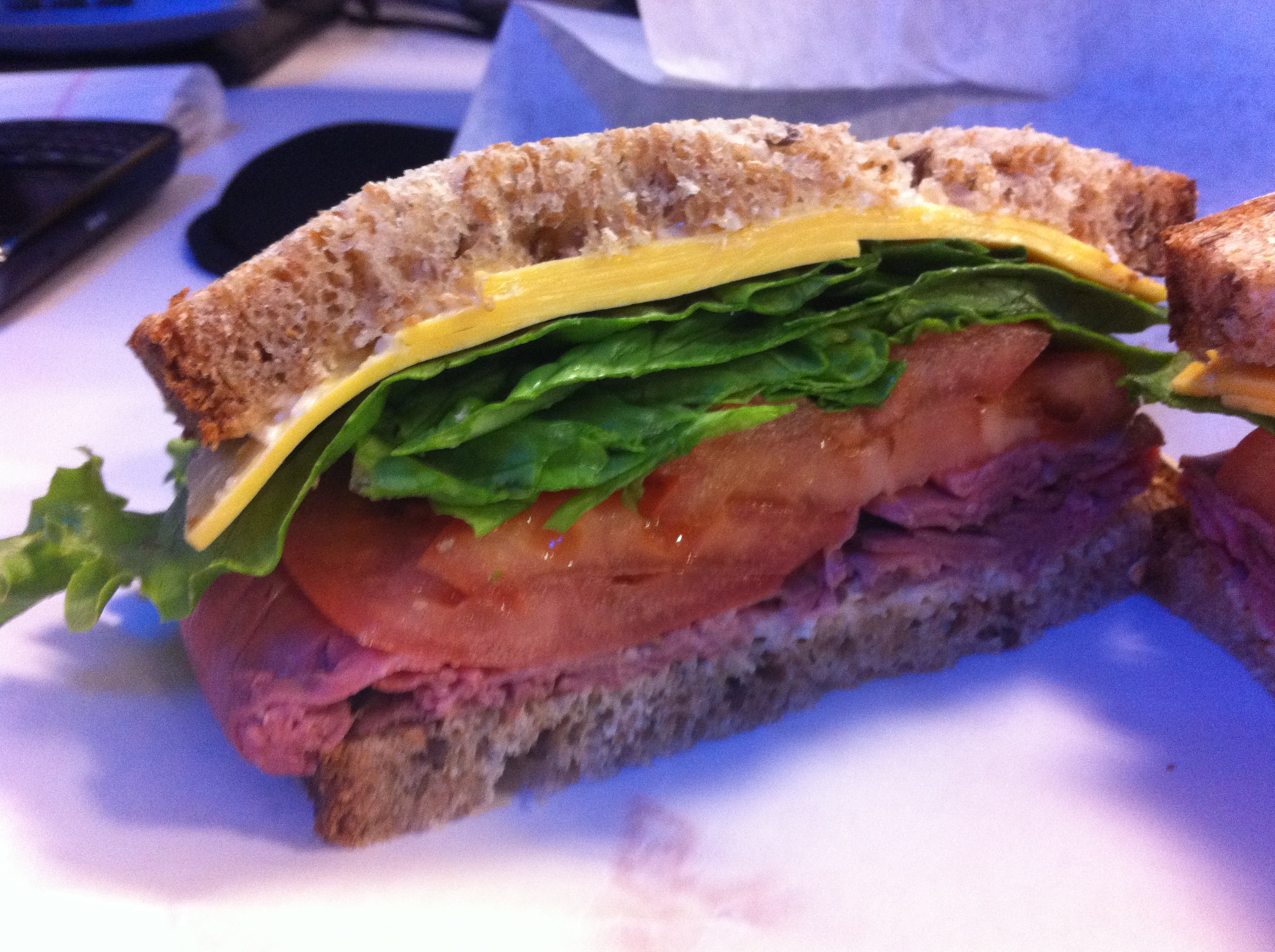 There’s a limited selection of sandwiches, which I guess is because they want to keep to a core set of fresh ingredients. I selected roast beef, American cheese, lettuce, tomato and horseradish mayo (which clinches the sandwich) on multigrain bread.The American cheese and the mayo played well together, though frankly I was hoping for more zip out of the horseradish. Instead it seems like a faintly flavored cream.