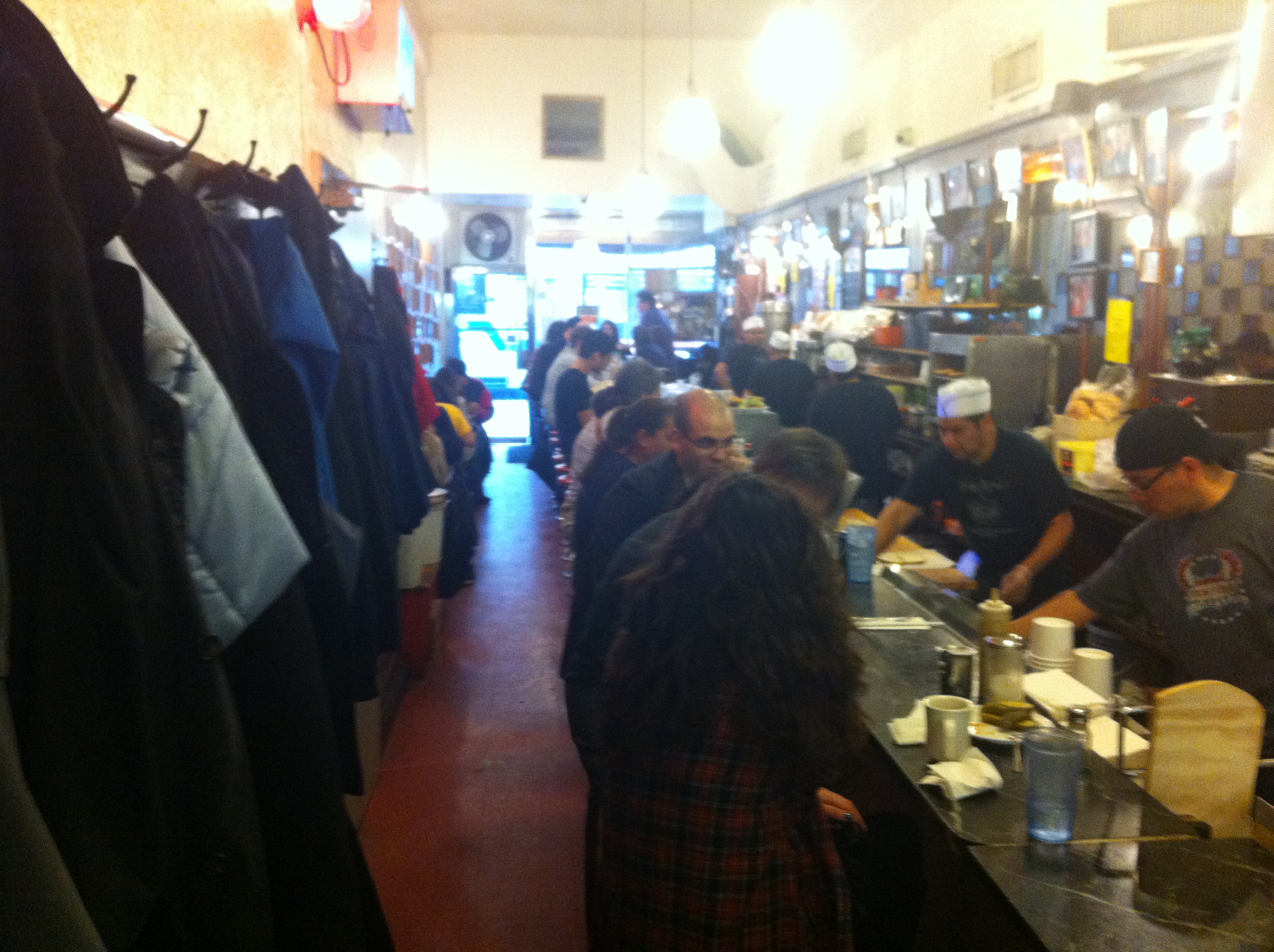 Eisenberg’s is a throwback. It is a long, thin railroad-car of a shop, with a counter, many stools, and a small eating area in the narrow back. It is the kind of place where you are likely to get nudged a little as people walk past. Additionally, hanging coats and other ephemera may make their presence known, depending on where you sit. In short, it is not a place that is big on comfort.
