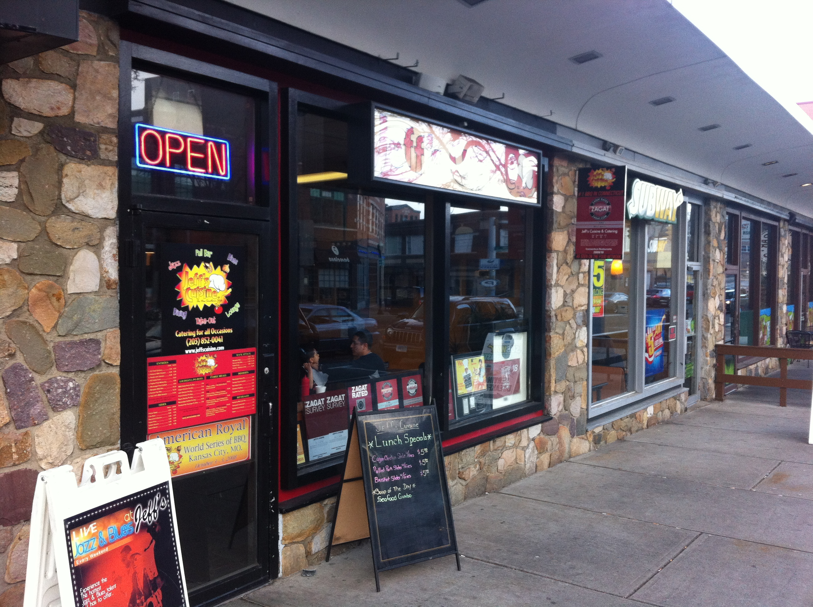 In the middle of South Norwalk, among the pizza places and restaurants, lurks a surprise. How could you possibly guess, according to Zagat, that behind this unremarkable storefront lurks the best place to find barbecue in Connecticut? Jeff’s Cuisine: Imagine my surprise at stumbling upon it.