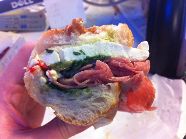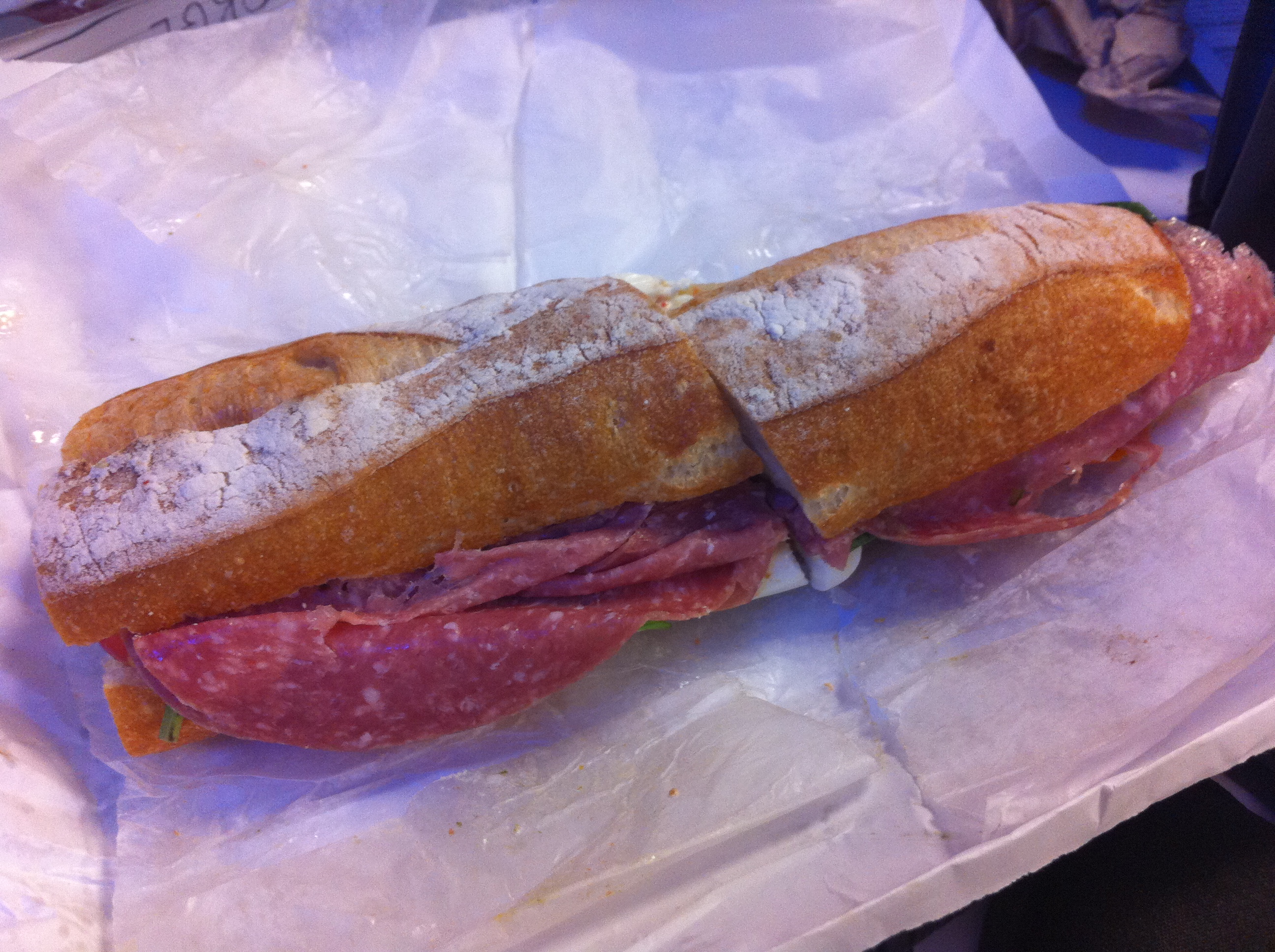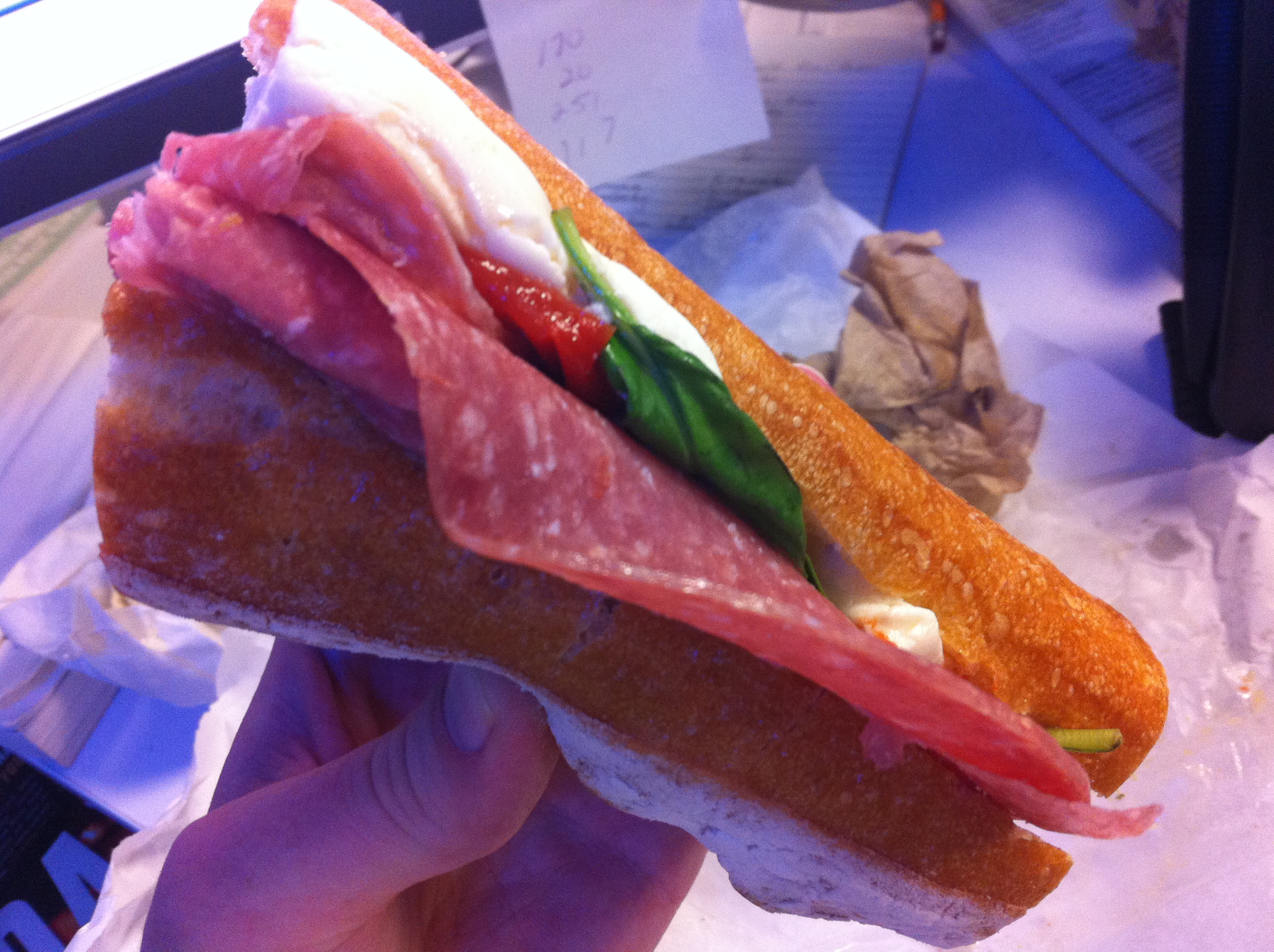 I opted for the salami and mozzerella sandwich. Watching it be prepared – the beautiful, fresh bread pulled from the box, the thick slice of fresh mozzerella, my attitude began changing, like the sun coming up or the tide coming in.