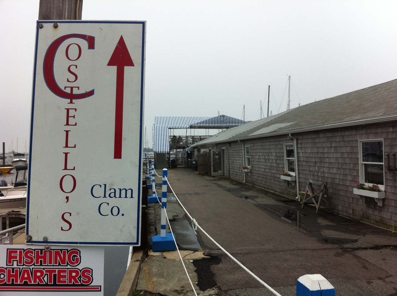 The view is not as charming as Abbott’s, nor is the place. The view that immediately greets you is more docks and parked boats, as opposed to Abbott’s, where the boats go slowly past on their way out of the harbor. The boats pass Costello’s as well, but not quite as close, and there’s the intervening nautical parking lot and pier to see past. It’s neat, but not as nice.