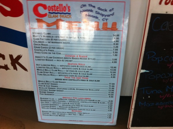 Abbott’s has a clam shack sister a few hundred feet away – Costello’s – so despite a day’s gluttony at the former (Hot Lob, bisque, corn on the cob, cole slaw, potato chips) – we decided to give it a whirl. Whereas Abbott’s does lobster in the rough and so on, Costello’s does fried clams.