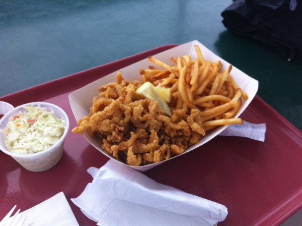 A word about the venue itself. Costello’s is located in a working dockyard. It is further down the same narrow, slow-speed street as Abbott’s. You pull in to a large parking lot and find your spot. Then it is a march down to the edge of a pier, and there, split on two levels, is Costello’s. On the lower level, you order you food. You can also eat at a few picnic tables. Above, there is more seating, under a tent-like roof, with tables and chairs as well as picnic tables.